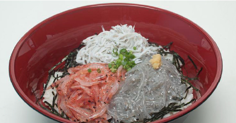 生しらす・釜揚げしらす・生桜えびがのった駿河湾名物満載の豪華な丼ぶりです。